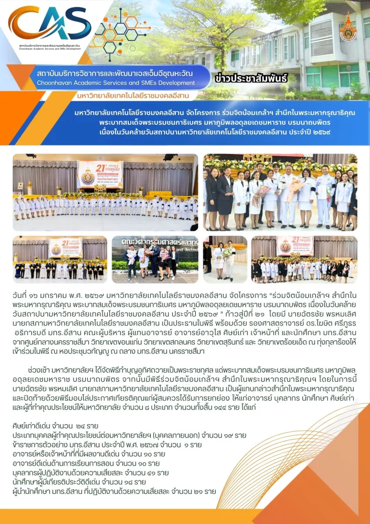 วันที่ ๑๖ มกราคม พ.ศ. ๒๕๖๙ มหาวิทยาลัยเทคโนโลยีราชมงคลอีสาน จัดโครงการ “ร่วมจิตน้อมเกล้าฯ สำนึกในพระมหากรุณาธิคุณ พระบาทสมเด็จพระบรมชนกาธิเบศร