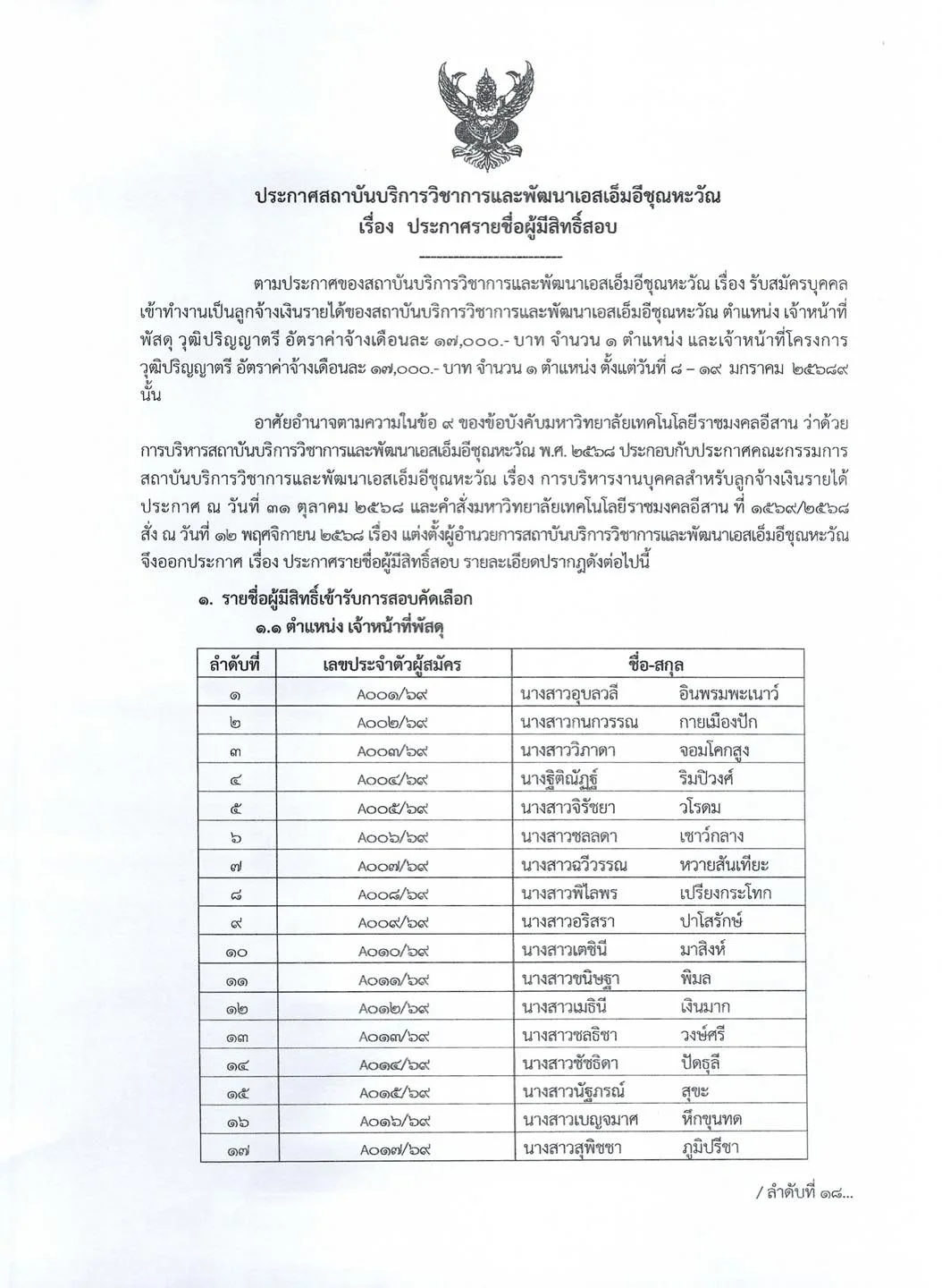 ประกาศรายชื่อ ผู้มีสิทธิ์สอบ สถาบันบริการวิชาการและพัฒนาเอสเอ็มอีชุณหะวัณ มหาวิทยาลัยเทคโนโลยีราชมงคลอีสาน January 20, 2026 ข่าวประชาสัมพันธ์ รายละเอียดปรากฎตามเอกสารแนบ