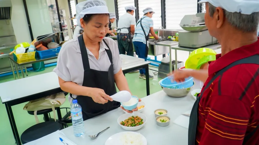 จัดกิจกรรมเตรียมพื้นฐาน1 งานเตรียมสำหรับอาหารไทย เตรียมผัก รายละเอียด เพื่อให้ผู้เรียนเกิดทักษะการใช้มีด รู้จักการหั่นผักแบบต่างๆทั้งแบบไทยและแบบสากล และได้ฝึกปฏิบัติการหุงข้าวสวย การทำข้าวผัดปู การทำกระเพราเนื้อราดข้าว ไข่ดาว