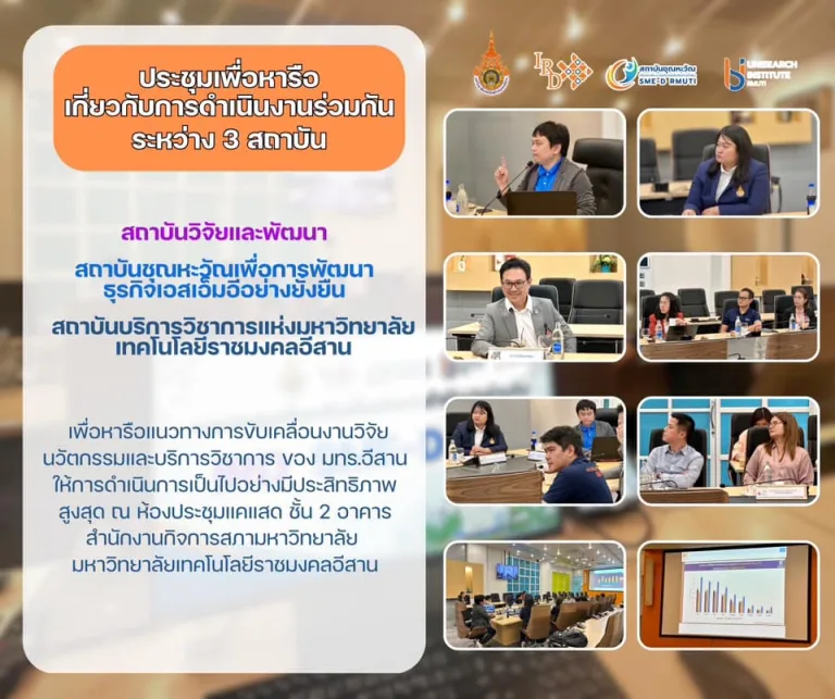 ประชุมเพื่อหารือเกี่ยวกับการดำเนินงานร่วมกัน ระหว่าง 3 สถาบัน คือ สถาบันชุณหะวัณฯ สถาบันวิจัยและพัฒนา และสถาบันบริการวิชาการแห่งมหาวิทยาลัยเทคโนโลยีราชมงคลอีสาน January 9, 2025 รายละเอียด